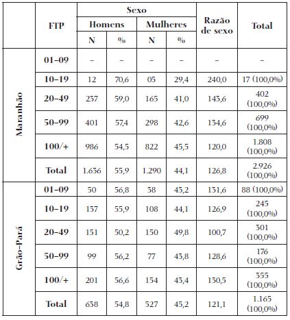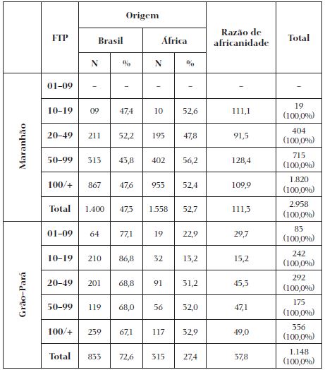 Apesar de as populações cativas das microrregiões analisadas terem apresentado razões de masculinidade relativamente semelhantes, existiam diferenças mais acentuadas entre as razões de sexo dos segmentos crioulo e africano de cada uma delas, particularmente no que respeita ao segmento africano. Enquanto na Ribeira do Itapecuru, as razões de masculinidade dos segmentos crioulo e africano eram de 101,3 e 155,8, no Baixo Tocantins e na Zona Guajarina, as razões de masculinidade de tais segmentos eram de respectivamente 94,2 e 238,7. Se, por um lado, a distribuição entre os sexos do segmento crioulo tendeu ao equilíbrio no Maranhão e a uma leve prevalência feminina no Pará, por outro lado, a distribuição entre os sexos do segmento africano tendeu a uma predominância masculina tanto no caso do Maranhão quanto no caso do Grão-Pará, sendo tal prevalência ainda mais efetiva no caso da escravaria do Baixo Tocantins e da Zona Guajarina - onde alcançou a proporção de 238,7 africanos para cada grupo de 100 africanas.