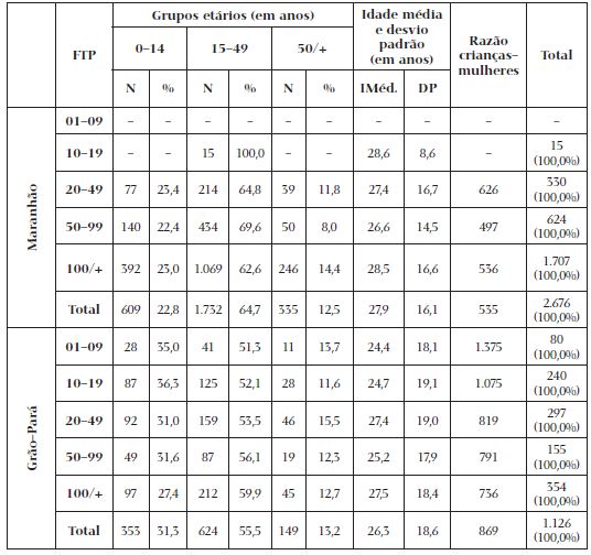 Os dados apresentados indicam que enquanto a população escrava da Ribeira do Itapecuru, entre os anos de 1785 e 1824, era conformada por 22,8% de jovens, 64,7% de adultos e 12,5% de velhos, seus percentuais correlativos para o Baixo Tocantins e a Zona Guajarina, entre 1810 e 1850, eram de 31,3%, 55,5% e 13,2% respectivamente. Tais populações eram majoritariamente constituídas por escravos adultos, sendo também expressivo o peso relativo de cativos jovens e pouco representativo o peso de escravos velhos em sua composição. Comparando as populações cativas de ambas as microrregiões, notamos que as mesmas possuíam um percentual semelhante de escravos velhos (12,5% no Maranhão frente a 13,2% no Pará), que o percentual de escravos adultos foi mais representativo no Maranhão (64,7% frente a 55,5% no Pará), e que o percentual de cativos jovens foi mais expressivo no Grão-Pará (31,3% frente a 22,8% no Maranhão). Os cativos do Maranhão se mostraram, em média, 1,6 ano mais velhos que os do Grão-Pará.45