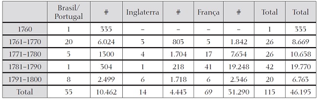 Os convites do rei de Ardra/Hogbonu não foram por acaso. A tabela 1 mostra que entre 1760 - data do primeiro registro de um navio realizando comércio em Porto Novo - e 1800, embarcações da França e da América portuguesa eram as que mais frequentavam o porto de Semé. Os ingleses tiveram uma participação muito modesta quando comparada à de outras nações, embora haja evidência de que navios ingleses frequentassem assiduamente Porto Novo em 1763.92 O pico do tráfico inglês encontra-se na última década do século XVIII, provavelmente em razão da retirada dos navios franceses do tráfico depois dos eventos em Saint Domingue. Ainda assim, seu número (seis navios) equivale à quantidade de embarcações francesas e é levemente inferior à de navios brasileiros (oito).