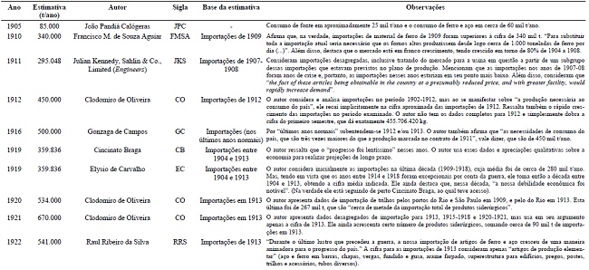 Ainda que a questão da dimensão do mercado doméstico e a forma como os contemporâneos estimaram essa dimensão não estejam desligadas - como de resto não poderiam estar - do teor dessas intervenções e propostas, a análise detalhada desse debate foge ao escopo desse trabalho.2 Concentraremos aqui nossa atenção nas propostas ou intervenções que tenham procurado estimar quantitativamente o tamanho do mercado doméstico para produtos siderúrgicos - ou, para usar uma expressão frequente à época, as “necessidades do país” em relação a esses produtos. Vista a questão de outro ângulo, tratava-se de avaliar (também) a capacidade de absorção desses produtos pelo mercado doméstico. Essas propostas ou intervenções que continham estimativas desse tipo não são todas, mas elas não deixam de constituir um conjunto representativo.