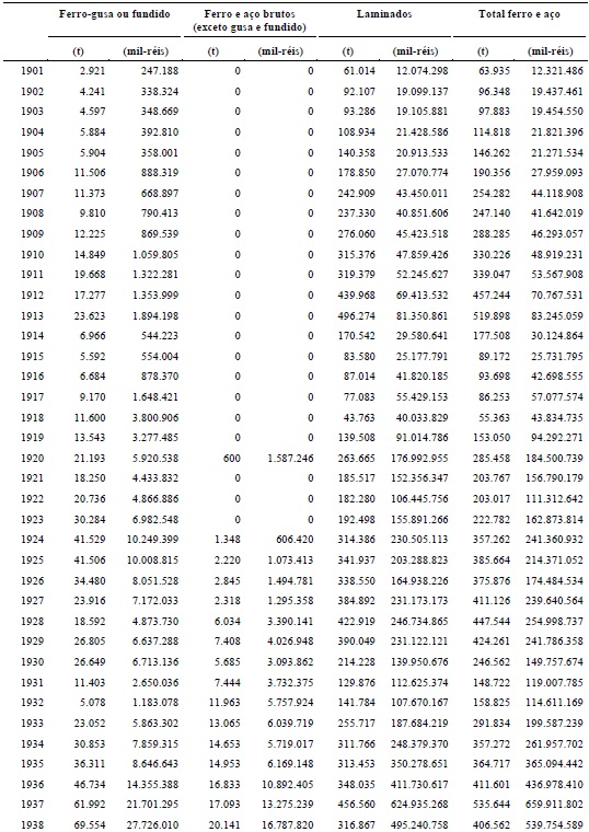Este artigo passou em revista a demanda brasileira por produtos siderúrgicos no período entre 1901 e 1940, tendo examinado distintos aspectos desse objeto: i) sua dimensão, tanto em quantidade, como em valor, como em participação no valor das importações; ii) sua composição; e iii) sua evolução no tempo ao longo do período. Na medida em que a insuficiência da oferta interna e os inconvenientes da oferta externa para atender essa demanda constituíam a essência mesma do “problema siderúrgico nacional”, que foi objeto de um longo debate entre o final da década de 1900 e o início da década de 1940, dedicamos especial atenção a como os contemporâneos conceberam essa dimensão material do problema. Para tanto, fizemos uso de ampla base de fontes primárias, incluindo diversas propostas e intervenções contemporâneas que procuravam estimar a dimensão do mercado doméstico desses produtos e também dados de importação e exportação compilados a partir de dados brutos desagregados previamente indisponíveis na historiografia.