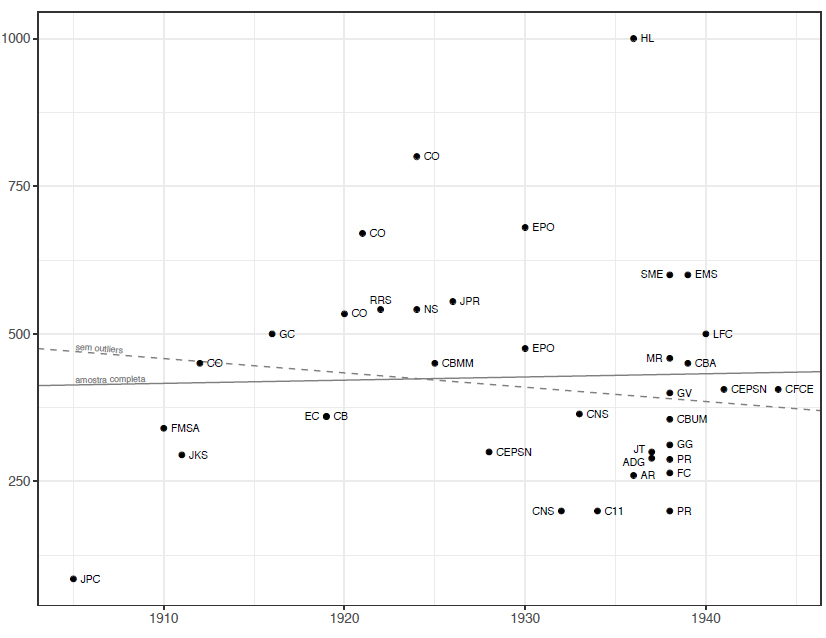 Em que pesem os motivos ponderáveis contrários à exclusão de observações discrepantes baseados em critérios puramente estatísticos, no caso das três observações em questão, existem motivos não estatísticos que poderiam justificar a sua exclusão da amostra. Vale observar ainda que a exclusão de qualquer uma dessas três observações individualmente torna o coeficiente de inclinação da reta estimada negativo. Note-se, ademais, que a média das estimativas contemporâneas na década de 1930 foi claramente inferior à das feitas na década de 1920 (405,1 mil t/ano na década de 1930, frente a 548,8 mil t/ano na década de 1920) ou mesmo à média das estimativas das décadas de 1910 e 1920 tomadas conjuntamente (478,2 mil t/ano).