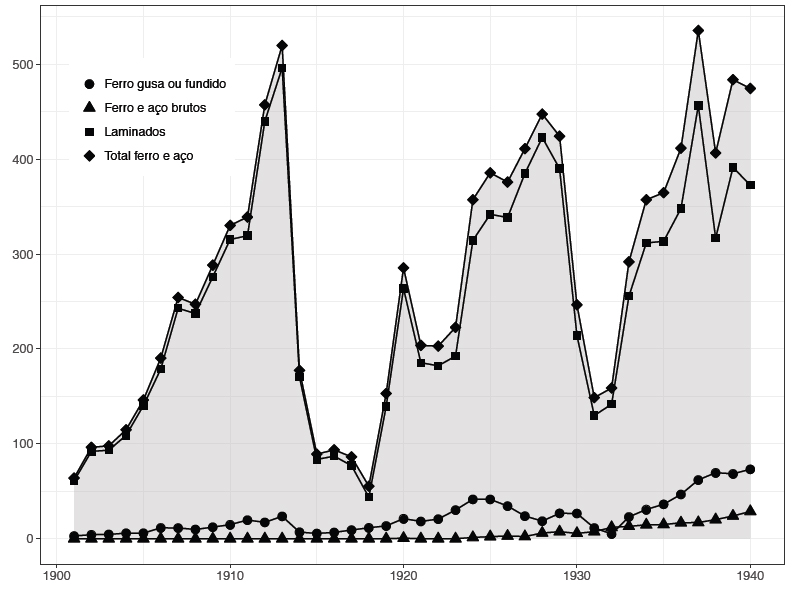 Um primeiro aspecto que chama a atenção no comportamento desses dados é que os laminados consistem na maior parte, de longe, do consumo aparente extrassetorial de produtos siderúrgicos. De fato, entre 1901 e 1940, os laminados responderam em média por 90% do consumo em quantidade e 96% em valor. Como vemos, havia efetivamente um consumo de ferro-gusa e aço na forma de produtos fundidos, mas essa era uma parcela pequena do total. O núcleo do setor siderúrgico - no Brasil, como em outros lugares - residia nos produtos resultantes da conformação mecânica do aço, tipicamente feita por laminação. Os laminados predominam claramente na composição do consumo e da demanda de produtos siderúrgicos. Tendo isso em vista, examinaremos adiante mais detalhadamente a composição das importações de laminados.