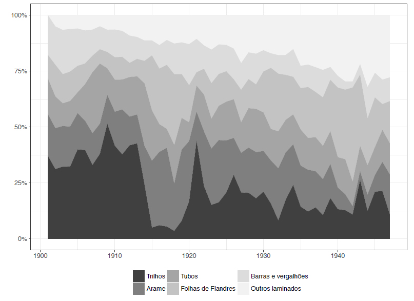 No entanto, ao longo do período em exame, a participação da importação de laminados com uso mais claramente industrial sistematicamente aumentou. Embora tenha continuado a ser muito relevante, a participação dos trilhos, por exemplo, reduziu-se significativamente, ficando abaixo dos 20% no final da década de 1930 (14% em média entre 1935 e 1939). Inversamente, aumentava a participação das importações de folhas de Flandres e sobretudo as de outros produtos laminados - compostos principalmente por chapas, lâminas e placas, mas também por perfis (cantoneiras, tês etc.), tiras e arcos. Assim, do ponto de vista do setor siderúrgico, o processo de desenvolvimento industrial em andamento no país não se manifestava tanto no volume global de produtos siderúrgicos demandado pela economia, mas sobretudo em alterações na composição da demanda. Portanto, a evolução da demanda ao longo do período correspondia a uma diversificação da sua composição com a manutenção da dimensão agregada, quantitativa, do mercado.