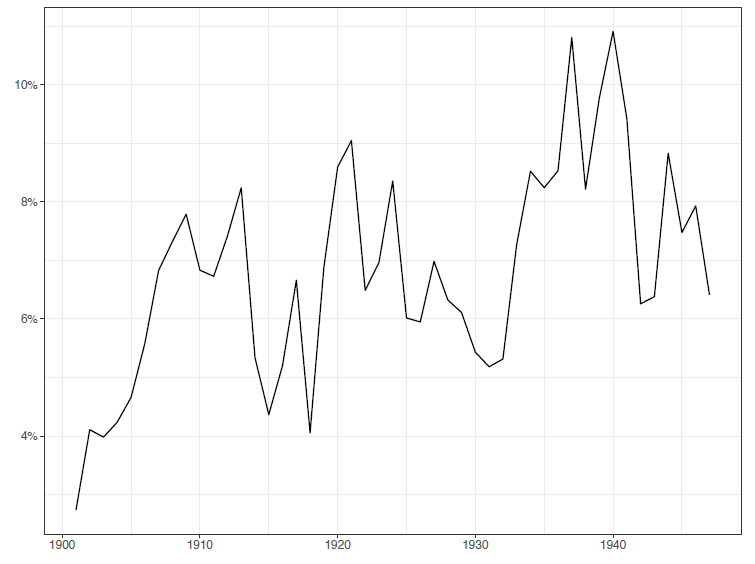 Por outro lado, e mais importante do ponto de vista da análise sendo aqui conduzida, apesar do esforço substitutivo em andamento, a pressão das importações siderúrgicas seguia montando. De fato, a participação do valor das importações de produtos siderúrgicos no valor nas importações totais, em meio a oscilações, mostrava uma visível tendência de crescimento ao longo do período, como podemos notar no gráfico 4. Como vemos, a participação dos produtos siderúrgicos no valor das importações totais fora de menos de 3% em 1901, atingindo pouco mais de 8% no pico de importações de 1913. Na década de 1930, em contrapartida, uma vez a economia emergida da crise, as importações de produtos siderúrgicos nunca responderam por menos de 8% do valor das importações totais no período 1934 a 1941, atingindo por vezes picos próximos dos 11%.
