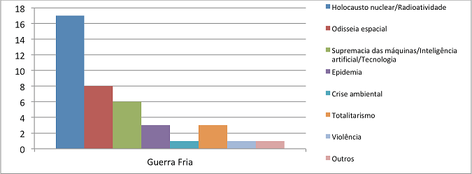 O Gráfico 1 apresenta oito temas, que aparecem 41 vezes nas 35 obras analisadas. Apesar da maioria dos trabalhos ter sido alocada, de acordo com seu tema preponderante, em uma única categoria, não foi possível fazê-lo com sete obras: Herdeiros do Poder (alocado nas categorias "Epidemia" e "Totalitarismo"), Planeta dos Macacos e De volta ao Planeta dos Macacos (alocados nas categorias "Holocausto nuclear/Radioatividade" e "Odisseia espacial"), 2001: Uma Odisseia no Espaço (alocado nas categorias "Odisseia espacial" e "Supremacia das máquinas/Inteligência artificial/Tecnologia"), Colossus 1980 (alocado nas categorias "Holocausto nuclear/Radioatividade" e "Supremacia das máquinas/Inteligência artificial/Tecnologia"), THX 1138 (alocado nas categorias "Supremacia das máquinas/Inteligência artificial/Tecnologia" e "Totalitarismo") e Fuga do século XXIII (alocado nas categorias "Holocausto nuclear/Radioatividade", "Supremacia das máquinas/Inteligência artificial/Tecnologia" e "Totalitarismo"). No caso de Laranja mecânica, mesmo com a análise do filme e do livro, ambos foram considerados apenas uma vez, na categoria "Violência", pois o enredo é praticamente o mesmo nas duas obras. O mesmo ocorreu com Planeta dos Macacos e sua sequência, já que a premissa sobre a crise global que levaria à supremacia dos macacos é uniforme nos dois filmes.