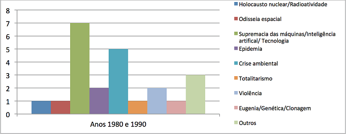 Desse período, foram analisados dois livros, Neuromancer (1984), de William Gibson, e Ensaio sobre a cegueira (1995), de José Saramago. Com relação aos filmes, foram estudadas 19 obras: Mad Max (1979), Mad Max 2: a caçada continua (1981), Blade Runner: o caçador de androides (1982), O exterminador do futuro (1984), Brazil (1985), Mad Max 3: além da Cúpula do Trovão (1985), Robocop (1987), Akira (1988), 3De volta para o futuro 2 (1989), O vingador do futuro (1990), O exterminador do futuro 2: o dia do julgamento (1991), O demolidor (1993), Waterworld (1995), Ghost in the Shell (1995), Doze macacos (1996), Gattaca (1997), O mensageiro (1997), O homem bicentenário (1999) e Matrix (1999). O Gráfico 2 mostra a classificação das obras quanto ao tema nas décadas de 1980 e 1990.
