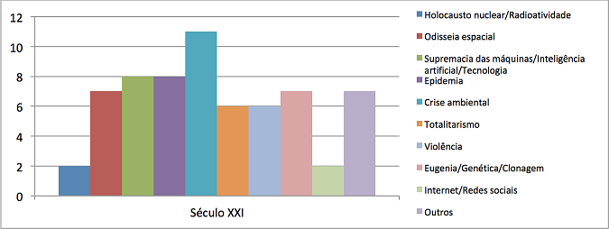 Em primeiro lugar, a análise do século XXI permite notar um equilíbrio maior nas representações de futuro. Mesmo com a ligeira superioridade das obras sobre "Crise ambiental", percebemos uma relativa paridade em quase todos os demais temas. Apenas para se ter uma ideia, no período da Guerra Fria, o tema "Holocausto nucelar/Radioatividade" ocupou 41,46% das obras analisadas. Somado às obras sobre "Odisseia espacial", esse número eleva-se para 60,97%. Já nas décadas de 1980 e 1990, o tema mais frequente, "Supremacia das máquinas/Inteligência artificial/Tecnologia", representa 30,43% das obras analisadas. No século XXI, por sua vez, "Crise ambiental" é responsável por apenas 17,18% das ocorrências, enquanto outros temas também são bem recorrentes: "Supremacia das máquinas/Inteligência artificial/Tecnologia" e "Epidemia", 15,09% cada; "Odisseia espacial", "Eugenia/Genética/Clonagem" e "Outros", 10,93% cada; "Totalitarismo" e "Violência", 9,37% cada.