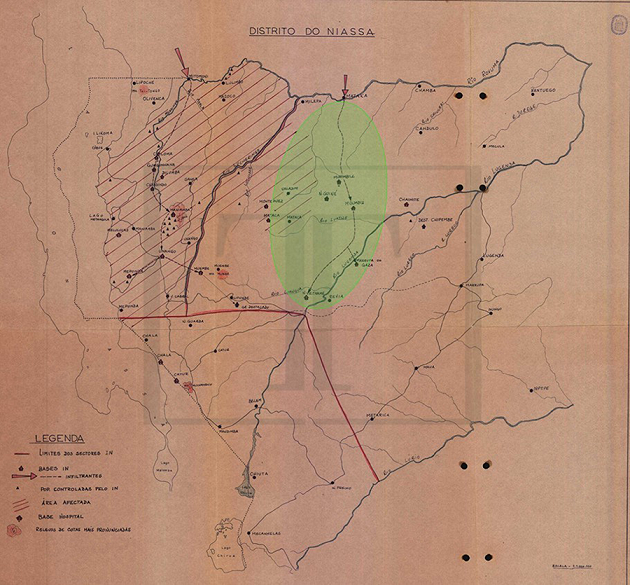 Porém, pouco antes, por volta de 15 de junho de 1965, o governador do distrito do Niassa tinha comunicado ao governador-geral de Moçambique que a Frelimo estava tentando se infiltrar na região oriental do distrito, estando a introduzir sua propaganda entre os Yao por via da circunscrição de Mecula.71 José Moiane, comandante da Frelimo no Niassa, registrou que, em meados de 1965, os portugueses descobriram a linha de infiltração de Chiwinde (no extremo noroeste do distrito do Niassa), utilizada pela Frelimo desde o início da luta armada, ligando a Tanzânia e o setor ocidental do distrito. O cerco que a tropa portuguesa estabeleceu em torno da área obrigou o comando da Frelimo a explorar a zona de Mitomoni (MOIANE, 2009, p. 72),72 situada a leste ao longo do rio Rovuma, junto da confluência com o rio Messinge. Contou ainda que, neste período, a Frelimo havia entrado em contato com o régulo Mataka em Marrupa, visando obter sua adesão e colaboração nas operações militares que deveriam ser desencadeadas na região oriental do Niassa.73