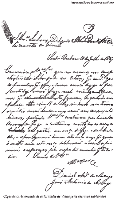 Comunico a Vªs. Sªs. que nos ac[h]amos em campo atratar da Liberdade dos Ctivos, P. amtº que esperamos P. ella, e como o noço desejo é par contodos e não fazer mal aninguem esperamos P. ella em Santo Ignacio e quando não apareça athe o dia 15 do meis vindouro não teremos remédio senão lançar-mos mão nas armas e la hirmos, podendo Vªs. Sªs. contarem que temos 1000 armas de fogo e contamos com todos os arcos dos Caboclos gentios em noça defesa e da liberdade (...). Somos de Vªs. Sªs.