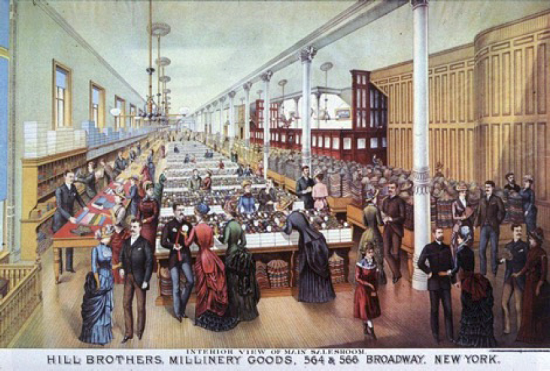 Nos Estados Unidos, o consumo de mercadorias logo fez parte do cotidiano de diferentes extratos sociais. As máquinas de costuras e os tamanhos padronizados deram origem a lojas de roupas prontas e aos catálogos de roupas que podiam ser encomendadas pelo correio e entregues até mesmo nos lugares mais difíceis. Na gravura acima, vemos uma loja em Nova York que pode ter sido bastante semelhante às primeiras lojas de departamento abertas nas décadas de 1850 e 1860. As principais mercadorias vendidas nesses locais eram panos, mas alguns itens do guarda-roupa feminino como meias, luvas, echarpes e xales já eram oferecidos às consumidoras.27