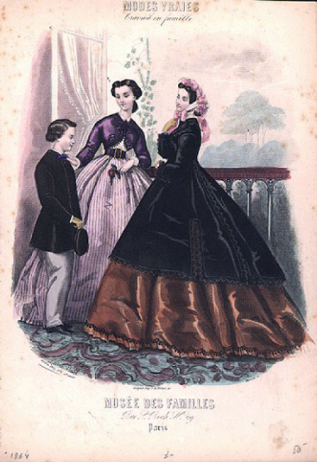 Em 1837, na Inglaterra, a princesa Vitória tornou-se rainha da Grã-Bretanha e, ao longo do século, teria enorme influência sobre as atitudes das mulheres em relação ao que iriam vestir e como se comportar. Casada com o príncipe Alberto, ela comprou em 1848 o castelo de Balmoral na Escócia. O gesto deu origem a certa moda de tecidos xadrezes que perdurou por muito tempo. Os xadrezes também reforçavam a ideia de domesticidade tão cara à rainha.55 Essa domesticidade feminina56 foi traduzida pelo sucesso dos padrões florais em tons pastéis usados no verão e primavera e dos estampados xadrezes em cores fortes predominantes no outono e inverno, símbolos dessa domesticidade burguesa.57 Foi dessa maneira que xadrezes, flores e saias amplas marcaram a silhueta feminina no século XIX. As roupas femininas passaram a traduzir uma crescente abundância de tecidos e a moda estabeleceu alguns de seus princípios básicos: a mudança constante de acessórios e itens do guarda-roupa para marcar o status social da mulher, o nascimento e estabelecimento de uma imprensa especializada em moda para mulheres, a criação e crescimento cada vez maior de uma indústria de confecções e de locais para venda dos novos produtos ligados ao vestuário. Nas palavras de Gilda de Mello e Souza, “a moda vai se tornar uma constante no século XIX”.58