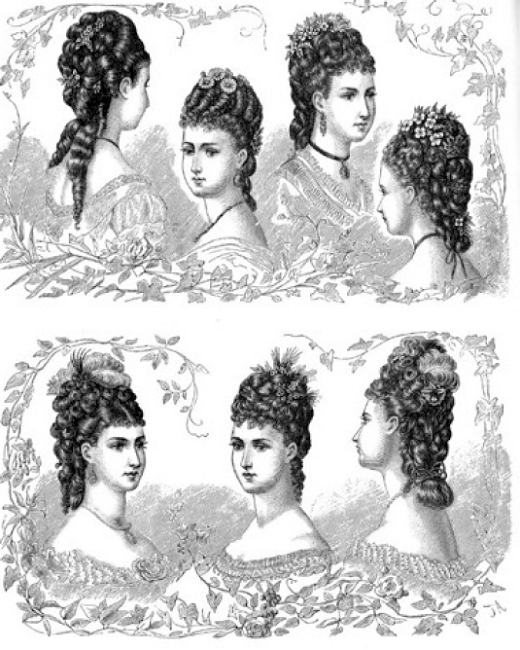 Os cachinhos feitos artificialmente, muitas vezes por cabeleireiros franceses, que caíam pelas orelhas das moças, foram os preferidos de meados do século. Na foto de 1870, vemos a princesa Isabel com seus cachos arrumados e prontos para a foto, de costas, com seu vestido enfeitado com laços de renda. O pescoço da princesa, ainda jovem, é adornado com uma gargantilha (provavelmente de veludo) que lhe descia às costas com uma cauda ampla. À falta de xampu, outros tratamentos eram dados às cabeleiras das moças e senhoras. “O famoso cabelo ostentava-se (...) em cachos acastanhados e trescalantes de óleo de babosa”.76