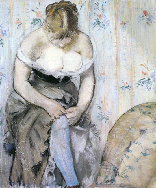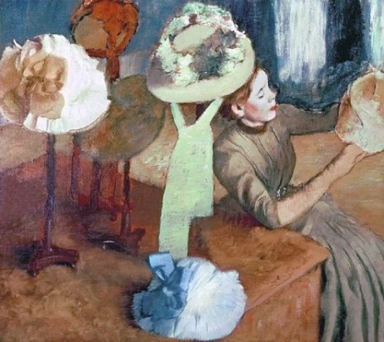 No quadro de Edgar Degas (1834-1917) (reproduzido abaixo) vemos uma mulher admirando chapéus numa loja. Vestida com um rico traje de seda verde e luvas altas, ela parece segurar na boca o alfinete que prenderá o chapéu escolhido. A loja é quase despida de elementos representativos; fora a mesa e os mostradores de chapéus, vemos cortinas e uma parede azul. As lojas do século XIX se transformaram em lugares preparados para receber mulheres, de modo que elas se sentissem confortáveis, seguras e gastassem dinheiro em diferentes mercadorias. Degas, propositalmente, deixou ambíguo o papel da mulher no quadro - será uma vendedora, uma fazedora de chapéus ou uma compradora? Ainda assim, a mulher estaria representada em todos os novos papéis que passou a exercer no período.