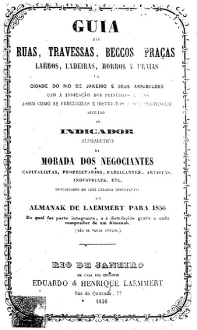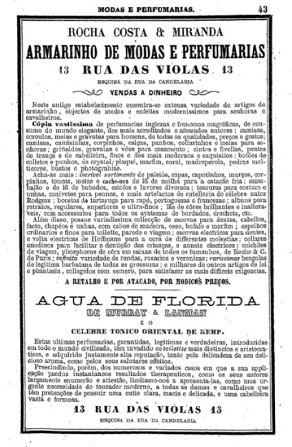 No ano seguinte, os irmãos Eduardo e Henrique Laemmert - editores da publicação - percebem o potencial comercial do Almanaque e começam a publicar a sessão Notabilidade, com anúncios e propagandas. A primeira propaganda é do consultório médico do dr. Manoel Pereira da Cunha Novaes. A seção médica será fixa até o fim do século, provavelmente fazendo muito sucesso. Aparecem propagandas do chocolate Vichy para indigestão, do professor de piano Achille Arnaud, da ótica de José Maria dos Reis. Nas primeiras propagandas voltadas às mulheres estão a dos armarinhos que listam tudo o que se podia encontrar na loja como o estabelecimento de Monteiro & Coelho, na rua da Quitanda n. 66, que possuía: objetos para bordar, lãs, sedas, frocos, talagarças, torçal, desenhos, linhas, caixas, galões, botões e todos os artigos destinados a modistas e costureiras.47 O Almanaque Laemmert refletia o que acontecia no próprio comércio, com a crescente especialização e diversificação de lojas e produtos. Ao longo do século XIX, o Rio de Janeiro “europeizava-se”, o que certamente incluía a adoção de costumes diferentes e o nascimento de uma sociabilidade baseada em festas e salões, em visitas e idas a estâncias climáticas como Petrópolis.
