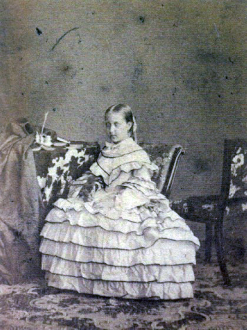 Em outra foto, alguns anos mais velha, no começo da adolescência, ela trajava saia e crinolina quando esta atingia seu máximo; o contraste com a cintura bem marcada é nítido, mesmo por debaixo do casaquinho de mangas abertas. A roupa estava na última moda e condizia com a imagem de uma princesa plácida e reservada.