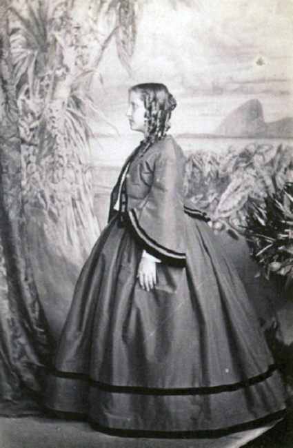 O uso da crinolina tornou-se uma febre entre as mulheres, sendo as confeccionadas com estrutura de aço muito mais leves que as saias e saiotes usados anteriormente. Os primeiros anos da década de 1860 viram o apogeu da crinolina que atingiu seu tamanho máximo. Sob a ditadura dessa peça, calculava-se que, para cada vestido, fossem necessários de sete a dez metros de tecido.61 No Brasil, a crinolina também teve lugar entre as mulheres de elite que saíam às ruas para as compras com amplas saias rodadas. Exemplos tirados da literatura nos mostram que a personagem de Lucíola, ou ainda Helena, de A carne, e Aurélia, de Senhora, sabiam se vestir e se comportar em sociedade. No álbum de fotografias da princesa Isabel, vemos uma foto da princesa em meados da década de 1850 em que se percebe claramente o uso da crinolina e os vários babados da saia.