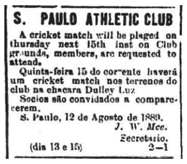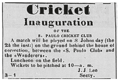 Essa posição é um indício de que a modalidade era ainda pouco conhecida do grande público, muito restrita aos britânicos e mesmo entre esses nem tão ativa assim. De fato, em São Paulo, foi somente no decorrer dos anos 1880 que as atividades de críquete ganharam maior dinamismo, inclusive em função da criação de novas agremiações.