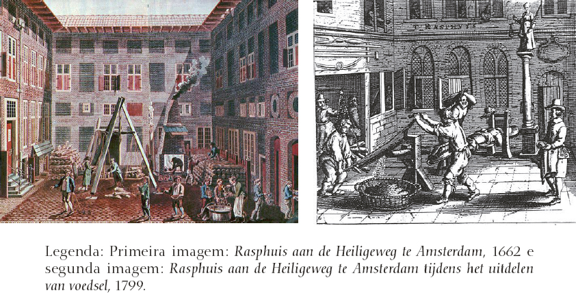 Na página seguinte as imagens retratam o cotidiano na Rasphuis, numa tradução livre, “casa de raspagem”, criada em 1596 em Amsterdam no prédio de um antigo convento. De acordo com Johan Thorsten Sellin, essa foi uma das primeiras instituições prisionais criadas na Europa em que os detentos cumpriam suas penas trabalhando.26 A prisão destinava-se a criminosos jovens do sexo masculino e os detidos cumpriam sua punição raspando pau-brasil. A primeira imagem de 1662 representa o processo de raspagem do pau-brasil pelos detentos, a fim de produzir um pó que, uma vez diluído, fervido e oxidado, originava o corante vermelho. A segunda imagem é de 1799, sendo marcante pela relação entre o vermelho da pintura e as ações representadas na imagem: no mesmo pátio da Rasphuis da imagem anterior, uma pausa para o almoço de alguns dos detentos, enquanto os demais continuavam a extrair a tintura vermelha das toras de pau-brasil.