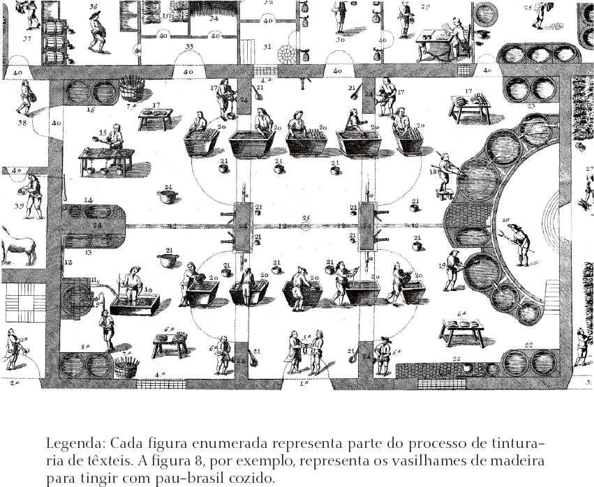 De acordo com o Regimento das fábricas de pano de Portugal de 1690, “os tintureiros serão avisados que não tinjam lã, nem panos em vermelhos do Brasil sem pé de ruiva e, depois de tintos nela, lhe poderão dar em cima o Brasil que for necessário”.28 O Regimento pressupõe que o pano seja previamente aprontado para receber o tingimento vermelho do pau-brasil, explicitando assim as técnicas empregadas não somente na produção da tinta, mas no próprio tingimento dos têxteis.