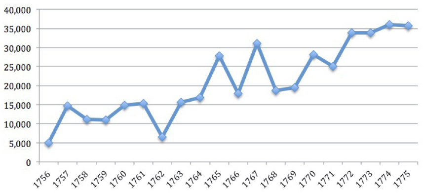 Entre 1756 e 1775, a sociedade mercantil retirou 1.798.624 toros, totalizando 422.131 quintais de pau-brasil. De acordo com o contrato firmado com a Coroa, entre esses anos os contratadores deveriam ter consumido 450.000 quintais, faltando assim 27.869. Esse fato não foi empecilho para que a sociedade continuasse no negócio, afinal isso explica uma cláusula diferente que apareceu no terceiro contrato, relacionando a oferta anual de pau-brasil com a irregularidade das frotas ou qualquer outro impedimento. É possível, portanto, que a extração do pau-brasil e seu transporte atlântico explique a irregularidade anual entre os quintais que deveriam ser retirados dos armazéns de acordo com o contrato e os valores que efetivamente foram retirados por seus contratadores. A mudança de comportamento no gráfico a partir de 1766 deve-se às mudanças de consumo de acordo com o contrato, passando de 20.000 para 30.000 quintais.