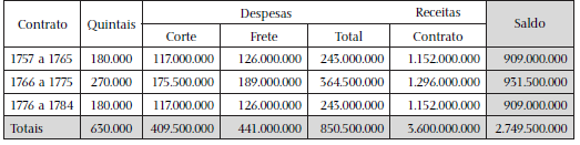 É possível estimarmos qual foi o ganho da Coroa nesses 27 anos de monopólio do pau-brasil a partir da análise desses contratos. Os contratos de consumo presumiam o valor mínimo por ano que o contratador deveria adquirir de pau-brasil; realizando uma conta simples constatamos que o contratador provavelmente consumiu 630.000 quintais em 27 anos. A cada contrato havia valores diferentes por cada quintal, sendo que ao fim dos 27 foram pagos 3.600.000.000 réis à Coroa. Considerando que no primeiro contrato do corte de pau-brasil foram pagos 650 réis para cada quintal cortado, estimamos o mesmo valor para todos os outros anos. Quanto aos fretes, eles eram pagos também por quintais e variavam de 600 a 800 réis. Estimamos uma média de 700 réis para cada quintal para todos os anos. Os valores obtidos seguem no quadro abaixo.