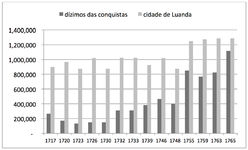 Comecemos sistematizando os números que possuímos sobre o dízimo, imposto cobrado aos povos, teoricamente 10% da produção agrícola, em troca do suposto pasto espiritual que deveria ser fornecido pelo Estado português às populações coloniais desde o padroado (1514). Existe uma série bastante completa entre 1717 e 1765. Seus valores em Angola, contudo, são difíceis de interpretar: tradicionalmente eram arrendados em duas partes, os da cidade de Luanda que eram cobrados aos proprietários de arimos, fazendas de policultura controladas pela população lusófona próximos da capital, e os referentes ao sertão que incidiam principalmente sobre a população avassalada dos sobados em torno dos distritos ao redor do Kwanza. Se pelos primeiros é provável que se pagasse uma parte da produção rural, pelos últimos a prática era os ramistas receberem uma pedra de sal de cada família (fogo) que valeria em torno de 80 mil réis na década de 1760, algumas varas de algodão e mais os “telecos”, a hospedagem do dizimeiro nas terras dos sobas. Os lucros dos contratadores eram o resultado da diferença entre o valor cobrado no sertão e os pagamentos que faziam à Fazenda Real em Luanda.36