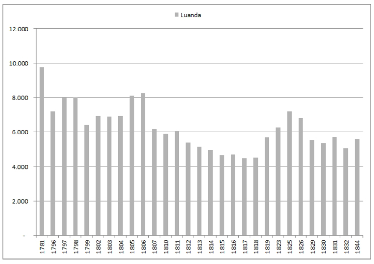 As exportações de pessoas de Angola e Benguela registram um forte crescimento na década de 1790, como se verifica no gráfico 5. Entretanto, a manutenção de valores altos nas deportações no início do século XIX, quando houve crescimento populacional, mostra que o Reino de Angola era capaz de sustentar a deportação de 200 mil pessoas em uma década e ainda assim manter uma demografia positiva. Esta afirmação, contudo, pode ser relativizada pelo movimento demográfico da capital que parece ser negativo durante quase todo o período.