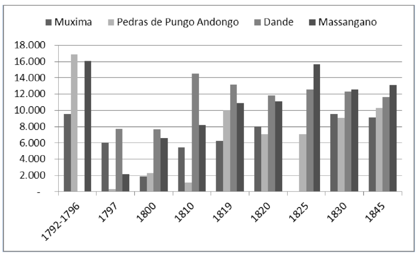 Deve-se notar ainda que as curvas dos presídios/distritos diferem em muitos aspectos da curva de Luanda, especialmente pelo ponto mais baixo da população da capital estar situado na década de 1810. Entretanto, a demografia da capital corrobora o sentido mais geral de redução que parece ter ocorrido na década de 1790, ainda que os seus movimentos populacionais estejam muito mais associados ao comércio atlântico do que as povoações do interior.