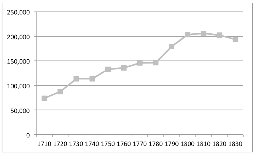 Recapitulando, portanto, a curva da população traçada pelos censos gerais de 1777, 1819 e 1845 apresenta a forma de um arco voltado para baixo: queda entre 1777 e 1819 e crescimento entre 1819 e 1845. Do mesmo modo, a população de Luanda, segundo os dados muito mais abrangentes organizados por Curto, mostra uma tendência relativamente parecida, mas as oscilações são obviamente muito mais expressivas. O ponto mais baixo encontra-se na década de 1810, como se verifica pelo gráfico 2.