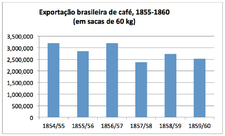 Somado ao gargalo provocado pelo transporte no lombo de mulas, que havia alcançado seu limite, a falta de braços teve implicação direta no volume de café exportado pelo Império na segunda metade da década de 1850: no ano fiscal de 1854/55, o país atingiu a marca de 3,190 milhões de sacas vendidas ao exterior, maior volume registrado para um único ano até então; em 1855/56, já sob o efeito da epidemia de cólera, foram 2,853 milhões de sacas exportadas, enquanto os anos seguintes marcariam uma oscilação com tendência de queda - 3,189 milhões em 1856/57, 2,380 milhões em 1857/58, 2,735 milhões em 1858/59 e 2,524 milhões em 1859/60 (cf. gráfico). Ao mesmo tempo em que a economia-mundo crescia em ritmo vertiginoso, ancorada no aumento expressivo do comércio global, da produção industrial e dos preços das commodities, o carro-chefe da economia imperial patinava, ainda que estivesse longe de ter sua liderança mundial ameaçada.12