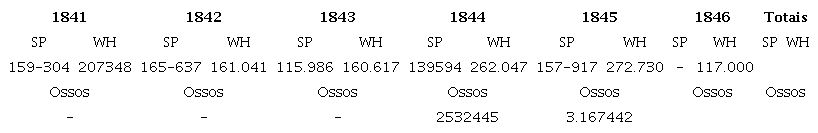 Dados colhidos na Gazeta de New Bedford oferecem detalhes da produção anual dos derivados de baleias e cachalotes, dividida por cidade, porto e temporadas, ainda que sejam pobres quanto à produção de ossos no triênio 1841-1843, apresentando números consistentes no biênio 1844 e 1845.22 Neste último ano, os americanos produziram o equivalente a 525.000 barris de óleo e espermacete juntos. No ano de 1846, a sua edição realçava o caráter especulativo da produção do óleo de baleias comuns, sem mencionar a do espermacete e de ossos.23 A Tabela 5 apresenta a produção de espermacete e óleo de baleia entre os anos de 1841 e 1846 em New England.