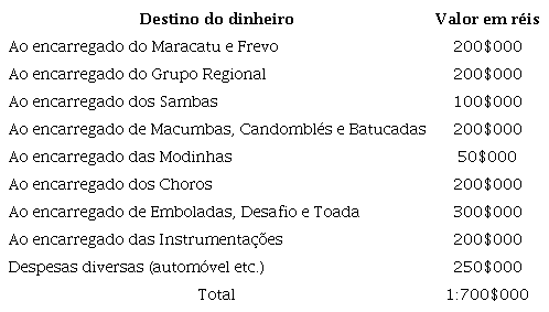 Apesar de insatisfeito com o valor estipulado (conforme veremos mais adiante), Villa-Lobos prosseguiu com a produção e arregimentou três representantes da nata da música popular produzida no Rio de Janeiro: Donga, Cartola e Zé Espinguela. “Na qualidade de encarregado de convocar e organizar os elementos para tomarem parte nas gravações do Exmo. Snr. Maestro Leopoldo Stokowski”, escreve no dia 29 de julho o célebre Donga (SANTOS, 1940), coautor do famoso samba “Pelo telefone”, solicitando um adiantamento para as despesas referentes à produção. A carta endereçada a Villa-Lobos estipulava o valor total de 1 conto e 700 mil réis, valor praticamente idêntico à cotação de 100 dólares na época, o que nos permite supor a anuência de Villa-Lobos, de Donga e dos demais músicos em torno do orçamento imposto por Stokowski. A carta especifica a distribuição da quantia conforme Tabela 1: