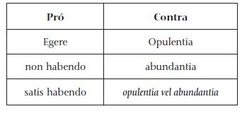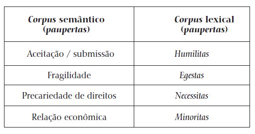 Sendo assim, podemos identificar dois grandes conjuntos: o corpus semântico da pobreza (conjunto de aspectos relacionados à produção de sentido) e o corpus lexical da pobreza (conjunto de palavras intercambiáveis com a pobreza). Para ambos os casos, estamos nos referindo à terminologia paupertas, bem como às suas formas intercambiáveis.Tabela 1