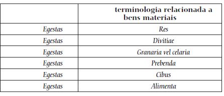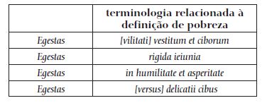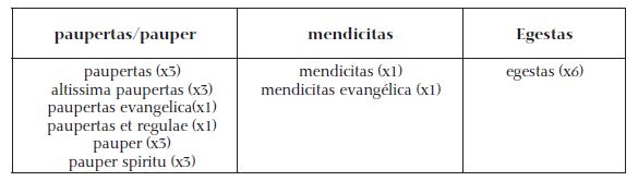 A egestas, por sua vez, vem associada a uma série de aspectos relacionados à propriedade e aos bens em geral, via de regra, representados por termos empregados no caso latino do genitivo (carecer de [algo]). É recorrente, portanto, no texto do Tractatus, a presença de expressões tais como egestas res, egestas divitiae, entre outras. Há uma insistência, portanto, na associação da Ordem à carência (egestas) de bens materiais: coisas, dinheiro, reserva de grãos, privilégios concedidos por poderosos, alimentos. Trata-se da prevalência do léxico da egestas sobre o da paupertas na delimitação dos aspectos da pobreza material Tabela 4.