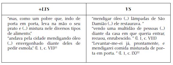 A esmola se encontrava relacionada, ainda, a um mecanismo de resistência à fragilidade: trata-se da fragilidade do espírito, associada ao conforto proporcionado pela vida material abastada. Esta não predispunha ao exercício do trabalho, sobretudo o trabalho realizado em condições adversas. A fragilidade espiritual ligada ao conforto material viria, portanto, a favorecer a otiositas. Essa era representada por toda vida pregressa de Francisco, caracterizada pela atividade usurária e pelo convívio inócuo com seus amigos. Ele deveria trocar uma alimentação substanciosa e ao mesmo tempo delicada, preparada por serviçais e servida em louças finas, pela “comida misturada” que pediria de porta em porta, justa recompensa por um trabalho extenuante. O “espírito delicado” de Francisco, consensualmente definido, no conjunto das narrativas, como burguês e abastado, não seria predisposto ao trabalho árduo ou ao consumo de restos de alimentos. Retomamos a LTS e a VS: o trabalho duro a ser realizado na reforma da igreja corresponderia à infâmia do ato de pedir esmolas. Labor físico e labor espiritual: ao trabalho físico extenuante corresponde um trabalho espiritual infamante. Como em outros aspectos da narrativa franciscana, há uma implicação de superação: na mesma medida em que se devem superar as adversidades da matéria, igualmente devem ser superadas as adversidades do espírito. Dor e fatiga, no caso material; vergonha moral, no caso espiritual.Tabela