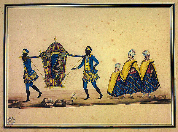 Entre 1780 e 1787, o casal morou em Portugal e galgou mais distinção social. Em 1782, Teodósio obteve patente de mestre de campo dos distritos de Jaguaribe e Maragogipe e, em 1783, o casal propôs uma ação de justificação de nobreza, recebendo suas cartas de brasão no ano seguinte.31 É provável que o casal tivesse essa pretensão quando planejou a viagem, o que explica ter embarcado com escravos que tinham como ofícios o serviço doméstico e o de transporte. A “preta” trabalhava de portas adentro, Antônio do Espírito Santo era lacaio, alfaiate e condutor de sege e Amaro e Sebastião carregavam a cadeira nos ombros. Ser transportado pelos escravos era um sinal distintivo no “ritual das exibições públicas”, conforme revela a iconografia de Carlos Julião, “senhora levada em cadeirinha e seguida de suas escravas” (LARA, 2007, p. 108-13).