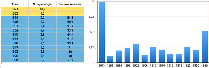Com a república, o critério censitário foi abolido. Em contrapartida, os analfabetos foram terminantemente proibidos de votar. Essas mudanças acabaram por dobrar o tamanho do eleitorado em relação aos anos finais da monarquia, como demonstram as linhas em azul na tabela 1. Esses dados dizem respeito ao comparecimento nas eleições presidenciais que ocorreram ao longo da Primeira República, não representam o eleitorado total, o que também justifica os picos de participação nas disputadas eleições de 1930, 1922 e 1910, que, como é indicado na última coluna da tabela 1, foram mais competitivas, implicando mais mobilização das estruturas partidárias estaduais e levando mais gente às urnas. Neste artigo, o que será analisado mais detidamente, no entanto, é que as reformas de 1904 e 1916 influenciaram objetivamente no tamanho do eleitorado dos pleitos subsequentes, retendo possíveis ciclos de expansão da cidadania política ao impor obstáculos processuais de acesso ao direito de voto. Em conjunto com a legislação restritiva que eliminava mulheres e analfabetos, essas reformas influenciaram objetivamente na retenção do tamanho do eleitorado.