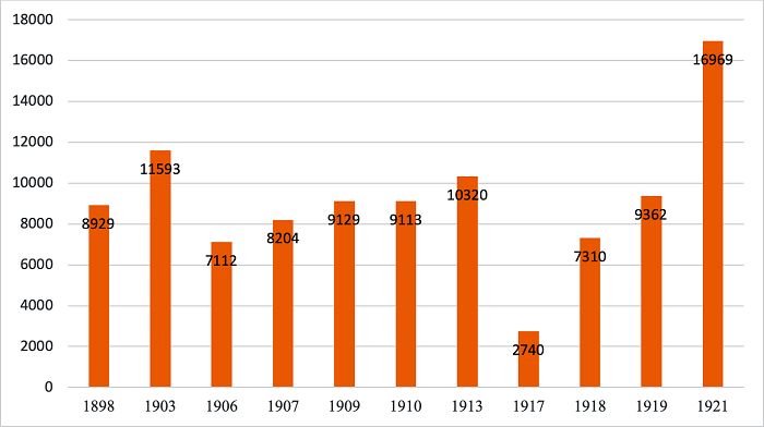 Em especial, o gráfico 2 aponta um grande crescimento do eleitorado de Salvador entre 1919 e 1921. Essa ampliação acentuada tem relação objetiva com os pleitos presidenciais de 1919, quando Ruy Barbosa foi candidato à presidência, e o de 1922, quando José Joaquim Seabra saiu candidato à vice-presidência. Ambos eram baianos, possuíam grande base eleitoral na cidade de Salvador e encetaram uma ampla mobilização para expandir seus eleitorados com a criação de comissões cívicas de alistamento.52 No decorrer da Primeira República, os índices de alistamento e comparecimento despontavam justamente nos pleitos eleitorais mais disputados. Foi o que ocorreu nas chamadas Campanhas Salvacionistas que, entre 1910 e 1912, transformaram as capitais de diversos estados em verdadeiras praças de guerra. Nas eleições daqueles anos, os mutirões de alistamento eleitoral foram um dos principais mecanismos de mobilização (BORGES, 2011; MELLO, 1953). Assim como nas eleições de 1919 e 1930, quando centros cívicos, clubes políticos, associações de ofício, sociedades recreativas, e uma grande variedade de agremiações foram convertidas em centros de alistamento.53 Na última eleição da Primeira República, a que registrou os maiores índices de participação do regime, esse tipo de mobilização da sociedade civil fez dobrar o número de eleitores no estado do Rio Grande do Sul, na cidade de São Paulo foram registrados doze mil novos eleitores em apenas um dia, jornais noticiaram que na capital do país trinta e três mil pessoas haviam sido alistadas pela primeira vez.54