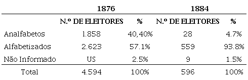 Dados semelhantes foram encontrados por Jairo Nicolau. Mesmo após a Lei Saraiva, esse autor indicou a presença de analfabetos em listas eleitorais de algumas freguesias do Rio de Janeiro. Ainda que em número reduzido, representando menos de 3% do total de eleitores, os analfabetos foram qualificados para votar nas freguesias de Campos e São João da Barra (NICOLAU, 2001, p. 10).
