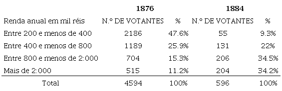 O eleitorado que foi às urnas em 1884 é praticamente um reflexo invertido dos votantes de 1876. Enquanto os índices de renda de 1876 formam uma pirâmide com uma ampla base formada por trabalhadores pobres, cujo volume vai se estreitando quanto mais altas são as rendas. Em 1884 observa-se o contrário, o maior número dos que foram alistados enquadravam-se nas duas faixas de renda mais altas, os cidadãos de melhor remuneração passaram a deter a primazia do voto, traçando uma configuração semelhante ao inverso da pirâmide de 1876, com a diminuição de volume do eleitorado à medida que as rendas dos sufragistas ficam menores.