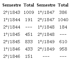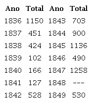 Não existe, ainda, um levantamento sistemático capaz de identificar o número de imigrantes açorianos transportados ao Brasil nas décadas de 1830 e 184069. Para o Rio de Janeiro, alguma correspondência consular refere o número de indivíduos provenientes dos Açores, do Minho e de Lisboa entrados no Brasil em um determinado período de tempo. É possível, ainda, estimar esse número a partir dos registros de entradas de embarcações nos portos da cidade no Diário do Rio de Janeiro, que indicam a proveniência e o nome da embarcação, o número de passageiros e de colonos transportados. Importa, contudo, observar que a comparação entre o número de portugueses ingressos levantados por esses registros e aquele comunicado pelo cônsul no Rio de Janeiro (quando existente) evidencia uma disparidade nada desprezível, pela qual se observa uma possível inconsistência nos registros feitos pelo jornal.