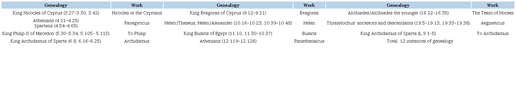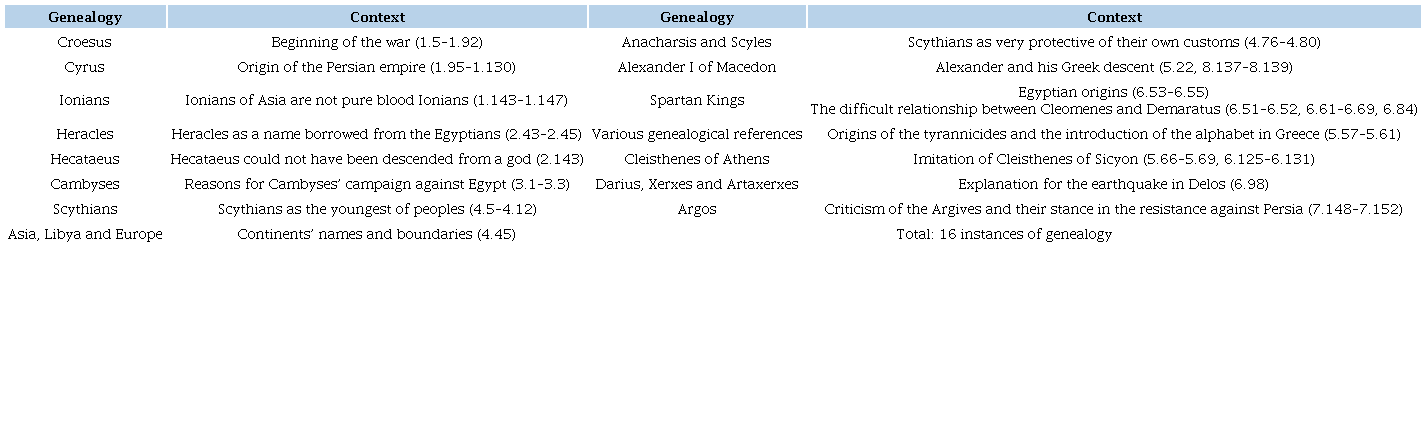 As a star ting point, I think it is useful to show an overview of the evidence. The first table focuses exclusively on genealogies found in Herodotus’ polemical passages. The second presents all genealogies found in Isocrates’ writings.7