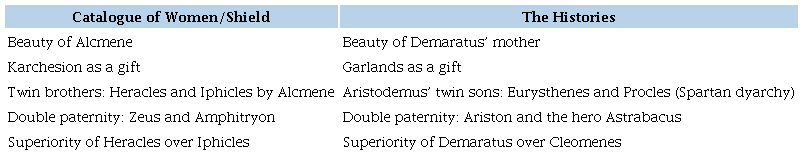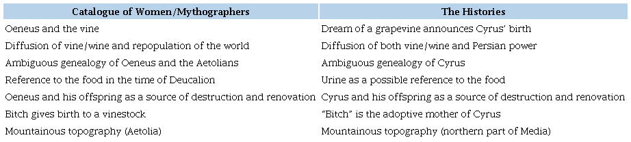It is striking that the arguments which the genealogies of Cyrus, Demaratus and Cleisthenes seek to prove – or rather rhetorically demonstrate – address the cause of very significant political changes, namely the foundation and legitimation of the Persian royal dynasty; a political crisis in Sparta with a rightful king being unfairly deposed and the other being overcome by madness followed by death; and the establishment of a new political regime in Athens. Furthermore, these genealogies are the ones most embedded in narrative and myth: the stories of Oeneus and the grapevine (Hes. Cat. Fr. 10, 22–23, 84, 179–180, 216 see also T2; cf. Apollod. Bibl. 1.8, Hecat. BNJ 1 F15, 113, Hyg. Fab. 129, Paus. 10.38),14 Heracles’ birth (Hes. Cat. Fr. 138–139, 187 = Sc. 1–56, 187; cf. Pherec. BNJ 3 F13),15 and Helen’s bridal contest (Hes. Cat. Fr. 154–156):16