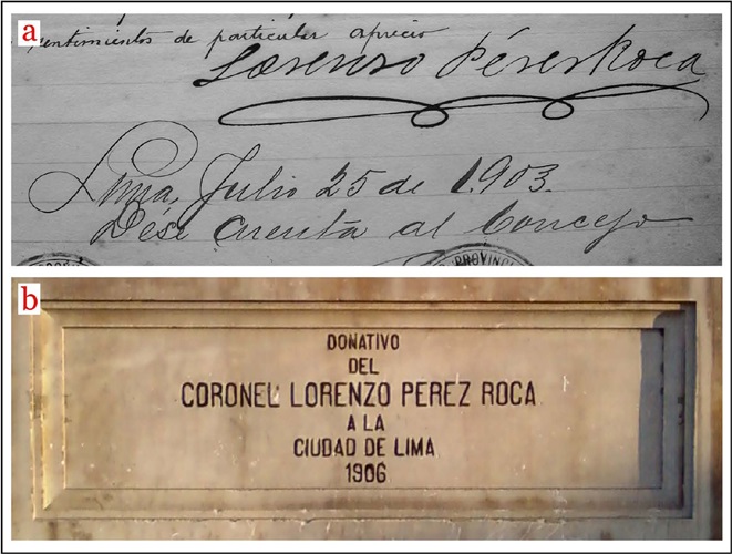 Asimismo, en la ceremonia inaugural de 1906 Pérez Roca habría sido uno de los invitados principales, de haber estado vivo o rememorado su legado, luego de su fallecimiento antes de diciembre de ese año, y los asistentes, nacionales e internacionales, habrían presenciado la develación del monumento donde fguraba el nombre y rango del donante. Todo ello habría quedado inmortalizado en las fotografías de los medios de prensa, nacionales y extranjeros. Además, con anterioridad su nombre habría tenido que ser resaltado por la prensa al reseñar al monumento y al comunicar sobre el evento inaugural y tendría que haber fgurado en los documentos oficiales de invitaciones cursados por el gobierno peruano. Situaciones que no se dieron porque el gobierno de Pardo y la oligarquía limeña no estaban dispuestos a aceptar la donación escultórica de un empresario peruano con negocios en Chile, debido a lo que San Martín representaba para el Perú en el contexto geopolítico posguerra del Pacífico, a lo que se suma la proximidad al centenario de la proclama de la independencia –1921– y que la donación de Pérez Roca le ganó a la iniciativa escultórica estatal.