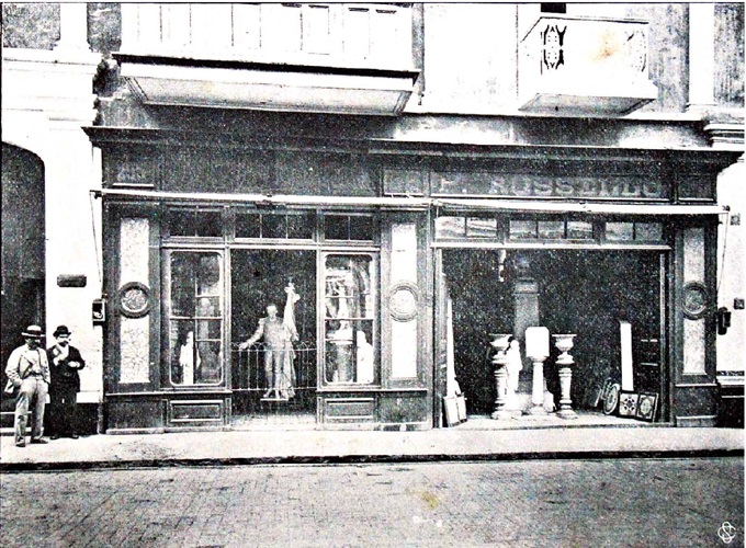 Pérez Roca resalta en este documento que era obligación suya encaminar con prontitud un monumento a San Martín (Figura 3a), aludiendo, entre líneas, los diversos fracasos estatales para conmemorar desde los albores de la República escultóricamente al prócer. Para ello, emplearía una escultura en mármol que el español Lorenzo Rosselló había realizado, motivado por su padre, para el fallido concurso estatal de 1890 para erigir un monumento a San Martín; única parte que el artista trabajó.11 Ya terminada, la expuso a la entrada de la marmolería de su familia en la calle Baquíjano (hoy Jirón de la Unión), a tres cuadras y media de la plaza Mayor. De esta manera, la escultura pedestre pasó varios años a la vista de los transeúntes de esta exclusiva vía y visitantes del taller (Figura 4).