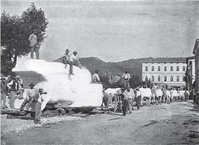 En la realización del monumento a San Martín también participó el tallador italiano Nicolli12, maestro de Rosselló en Italia hasta 1887. Él se encargó de realizar el soporte monumental y la alegoría a la Victoria que lo coronaba, es decir, gran parte de la obra, ya que Rosselló murió en 1901. Nicolli no vino a Perú, trabajó desde su país (LARRAÑAGA, 1906; El MONUMENTO A…, 1906; COLOCACIÓN DEL MONUMENTO…, 1906). Una nota y fotografía de 1905, publicados en Lima, explica y muestra el acarreo de los bloques de mármol extraídos de las canteras de Carrara, que serían empleados por el artista italiano (CORONEL DN LORENZO…, 1905; MONUMENTO A SAN…, 1906c) (Figura 5).