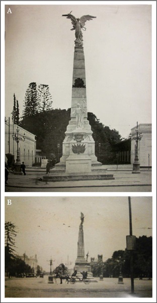El monumento de la Victoria de la batalla de Ayacucho fue diseñado por los miembros de la Municipalidad barranquina y trabajado por artistas y obreros nacionales. Consistía en un obelisco con altos relieves, placas e inscripciones que aludían al evento bélico. En la parte alta se colocó la alegoría de la Victoria.34 En términos generales, la obra era la reproducción fel de la versión original del monumento a San Martín. Si las críticas del alcalde de Barranco afirmaban que el “ángel de la Misericordia” le restaba importancia a la escultura de San Martín y que más parecía un monumento a este “ángel”, en el monumento dedicado a la Victoria alcanzada en Ayacucho el “ángel” seguía siendo la fgura principal. Es más, la plaza Ayacucho donde se colocó este memorial con rapidez perdió su nombre, ya que la gente comenzó a denominarla como “plaza del Ángel” (RODRIGO FERNÁNDEZ, 1994).35