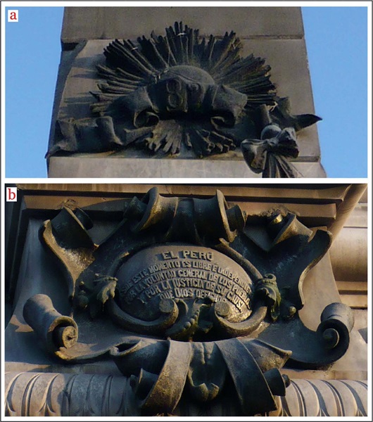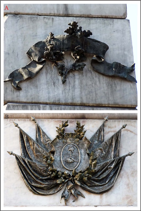 En la parte media de la cara frontal del obelisco un escudo de bronce a modo de sol radiante luce un pergamino con el año de la proclama: “1821” (Figura 8a). En la parte alta de la cara posterior, hay una rama de encina con una cinta, ambas en bronce, en donde se grabaría el año en que se inauguraría el monumento (EL MONUMENTO DEL…, 1905) (Figura 10a), y en la parte inferior está el escudo de Argentina, también en bronce (Figura 10b). El obelisco tenía siete niveles almohadillados. En la parte superior había un pedestal de tres niveles donde estaba sobre nubes la alegoría alada de la Victoria, representada como una joven con túnica movida por el viento, con las alas levantadas y sosteniendo con la mano derecha una rama de olivo y con la mano izquierda una corona de laureles (Figura 11).
