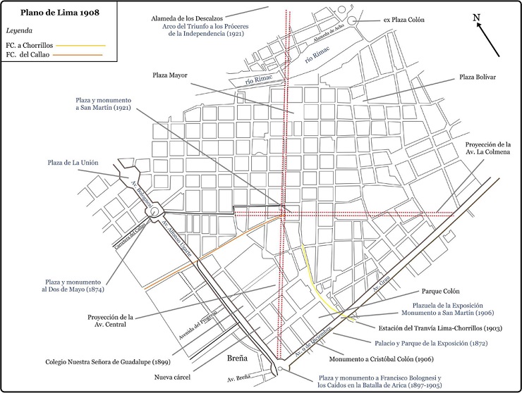 Antes de la Guerra del Pacífico se inició la destrucción de las murallas virreinales que rodeaban el viejo casco urbano de Lima. Tras finalizado el conficto se concluyeron las obras y se implementaron grandes vías denominadas avenida Circumbalación. A fines del XIX e inicios del XX sus tramos fueron renombrados como tres de los héroes de la guerra de 1879 (Bolognesi, Alfonso Ugarte y Grau) y como la fecha que recordaba la batalla que decidió la capitulación hispana en 1824 (9 de Diciembre). A partir de entonces estas vías pasaron a dividir la vieja de la nueva Lima, que se expandiría principalmente al sur (RAMÓN JOFFRÉ, 2004), y a ser emblemas de la nueva modernidad hacia la cual se encaminaba la ciudad y el país luego de la guerra.
